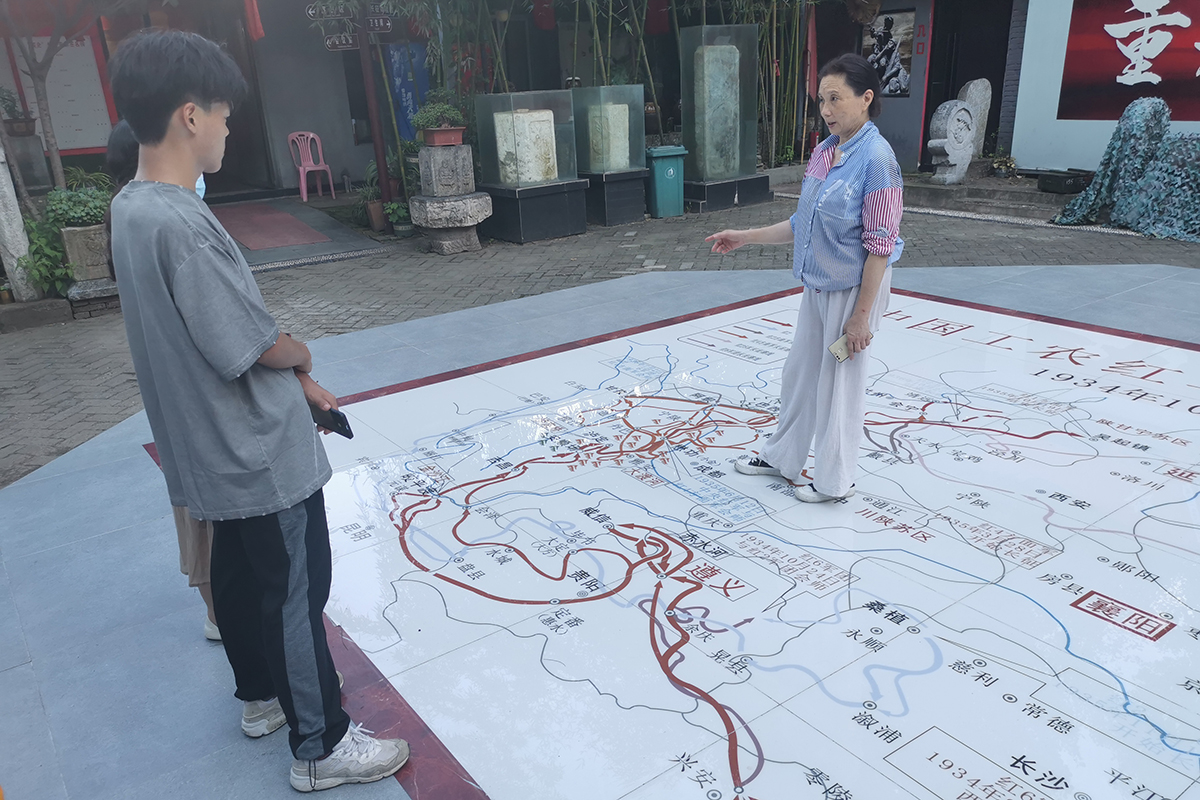 7月26日,实践团一行人来到了红色记忆收藏馆。进入馆内,数量众多的展品使实践团成员目不暇接。跟随馆长的脚步,成员们穿梭于一个又一个摆满展品的房间,那红色的历史再次映入眼帘。在院子中央的地面上,赫然躺着一块巨大的,刻有红军长征图的大理石石板。站在石板上,馆长为成员们讲解红军长征的伟大历史,语重心长地说道:“望各位同学铭记长征精神,即便遇到千难万险,也要闯过去。”实践团队长李永攀不禁念出旁边的碑文:“红军不怕远征难,万水千山只等闲。”毛主席的诗句铿锵有力,实践团成员们的心中也燃起了奋斗之火。